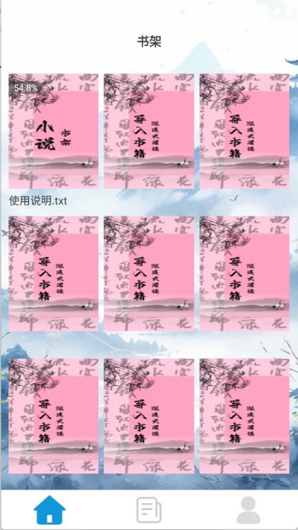 本图书软件仅支持本地导入的方式进行阅读您可通过,首页书架-导入书籍按钮进行快捷导入电子书,软件会自动扫描本地超过200k大小的txt小说资源,方便快捷。导入完成即可进行沉浸式阅读体验