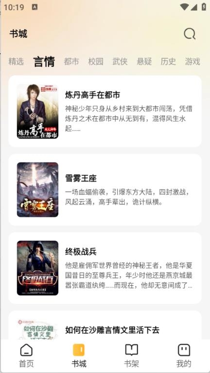 3、“书城'页面,将小说进行了详细的归类,包括言情、都市以及校园等类型。