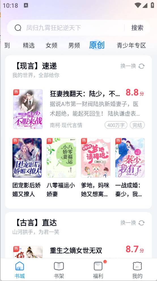 2、“书城”页面,为用户提供了超级多的小说资源,包含男频、女频以及原创等类型。