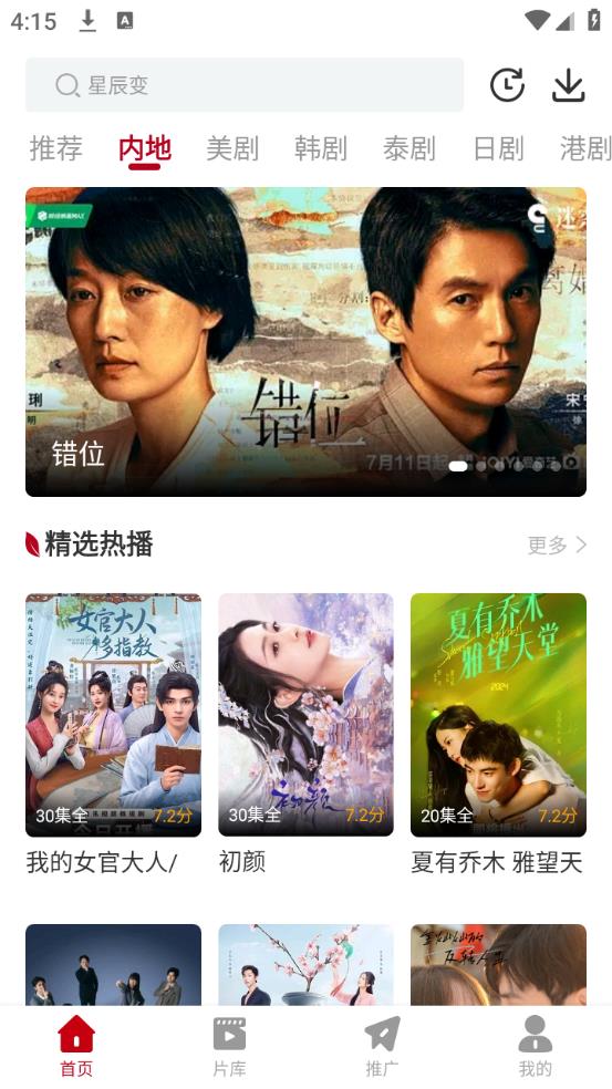 2、首页以及片库栏目为用户提供了海量的影视资源,国内外优质电视剧、电影以及综艺等。