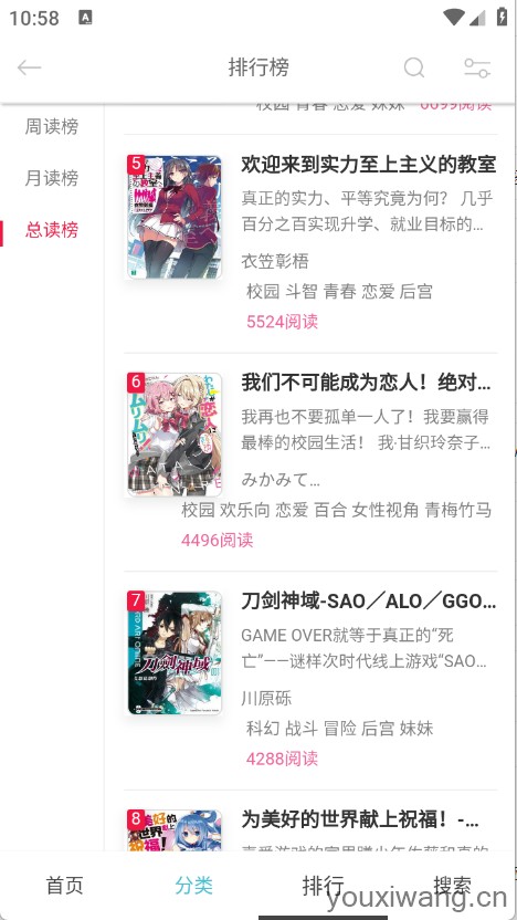 3、分类页面将小说进行了详细的归类,青春、恋爱以及校园等类型都有。