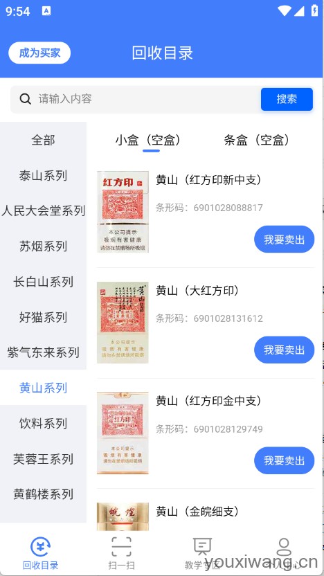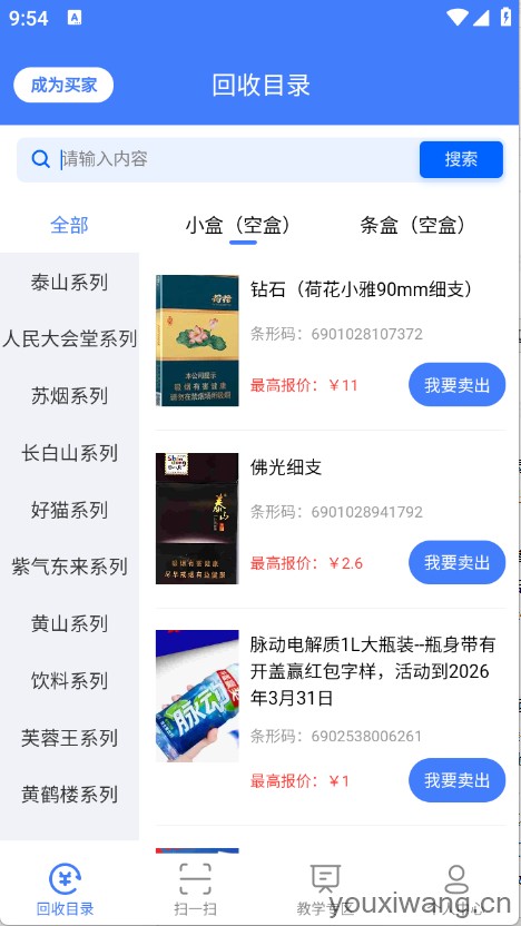 1、用户可申请成为买家,自主定价收购,进行烟盒交易。