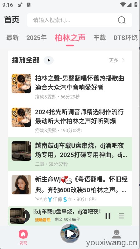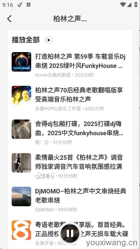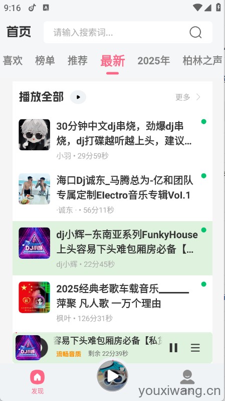 DJ串烧库,为dj爱好者打造的音乐软件,有推荐榜、热播榜等,帮助用户精准找到自己喜欢的音乐资源,另外音乐资源更新速度快,帮助用户可以轻松畅听音乐,创建歌单,将喜欢的音乐加入到歌单随时都可以开启听歌体验。