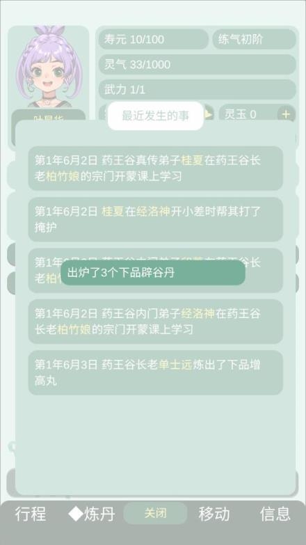 5、丹药品阶从高到低依次是天地玄黄宇宙洪荒,五行从上到下是金水木火土,所需的五行每到一个节点品阶就会上升一个阶段,每提升一个阶段炼丹的成功率会下降,时间也会增加。药女修炼主要通过炼丹涨灵气,药材越高级涨的越多,炸炉了也会涨,如果不想炸炉可以在炼丹前存档。