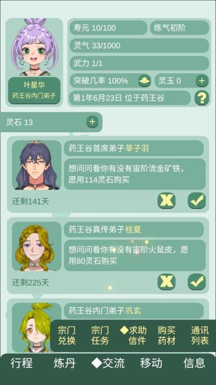 3、开局有10点精力,可以多结交好友,每天会恢复一点精力。前期需要多刷贡献点,可以通过提交生日亲友送的高阶药材来获得大量贡献点,有贡献点后就可以解锁各种丹方。