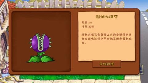 3、开局会详细的向玩家展示植物的属性,如潜伏大嘴花,花费:100,冷却:30秒。