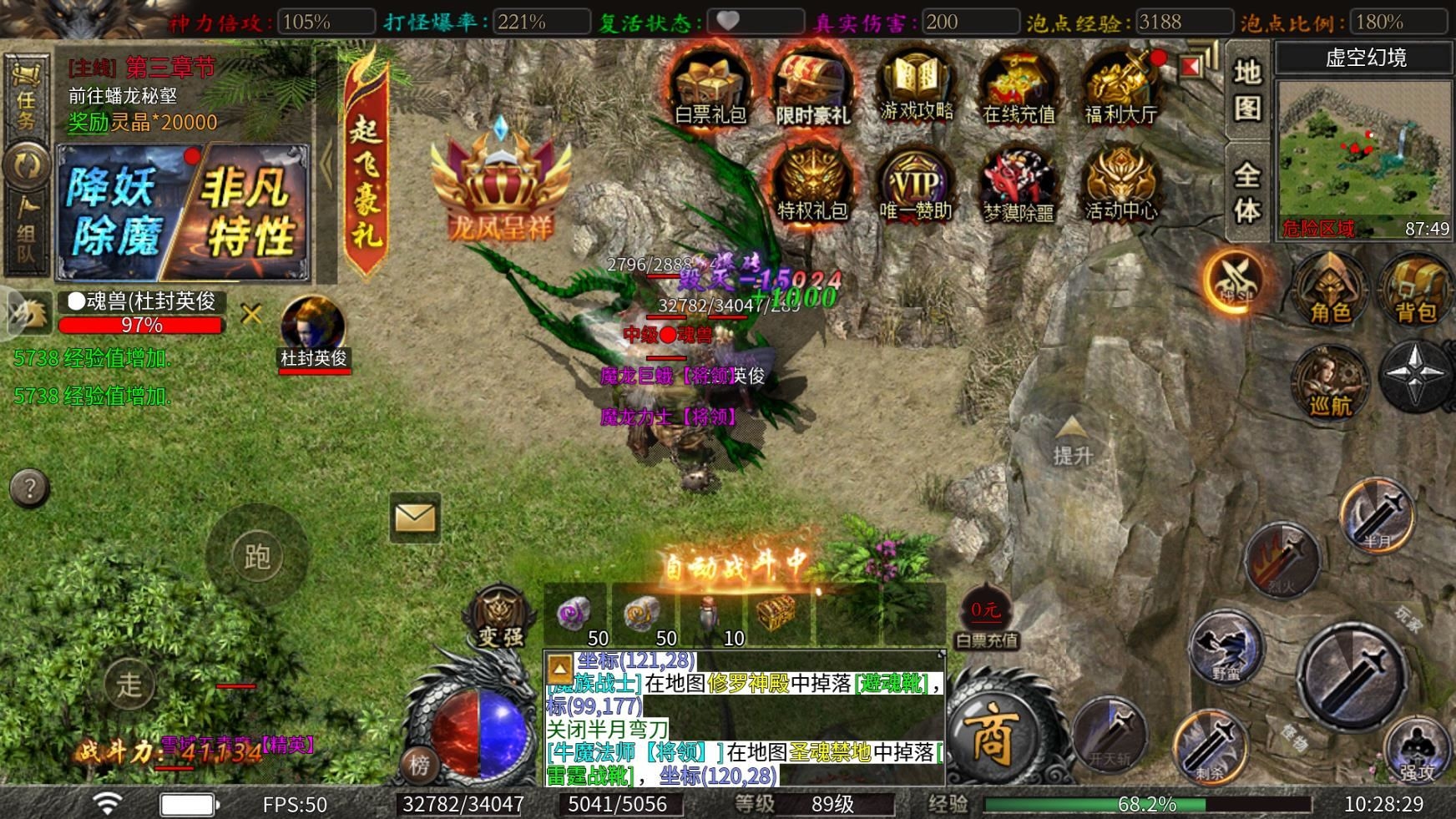 4、每个地图都会刷新魂兽,击败魂兽会必爆充值点。万魂幡会使强大怪物一定几率变异为魂兽,击杀魂兽有几率变成更高级魂兽,击杀强大怪物会按照怪物血量变异为对应等级魂兽。魂兽是特殊怪物,只有绝对伤害值才能击败它,精魄值=绝对伤害值。