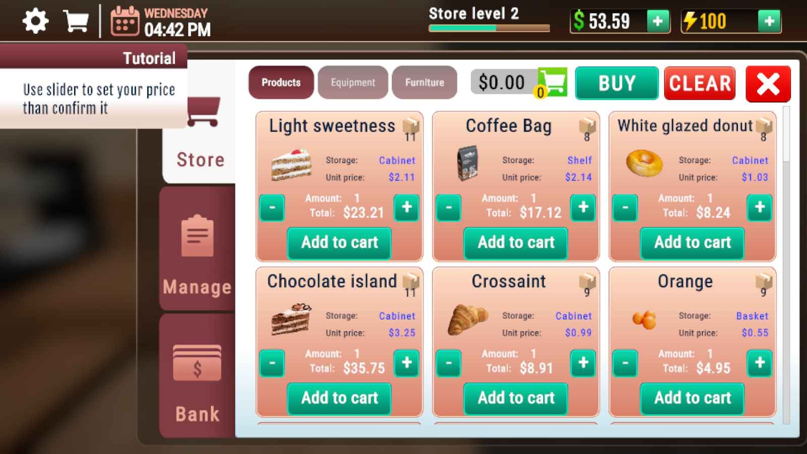 2、店铺内有很多的设施,全部都能自由的升级,也能摆放在合适的位置,一切随你操作。