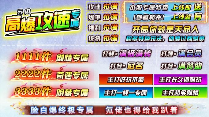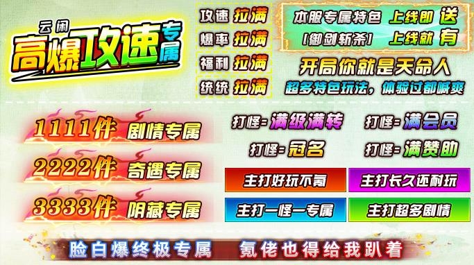 云闲高爆攻速专属,185神器转速攻速版本,上线就送飞剑自动打怪,人人皆可当李逍遥!冠名、赞助、会员等惊喜功能通通打怪就能免费白嫖,并且还能白嫖到顶哦!游戏内一切全靠打,刀刀涨大麦,刀刀涨灵符,无脑杀怪,轻松逆天改命!本服时间就是王道,只要花时间你就能够变强,散人照样能够逆袭当大佬!