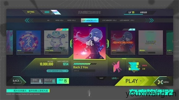 亮青色搭配荧黄深紫让整体画风完全饱和了我的喜好!尤其是打歌前播放的那段日语女声,硬戳我的雄雌双感!游戏排版是不用说出来的新奇,会不会因为种种原因让体验感增强呢。