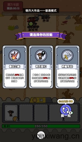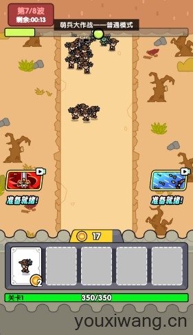 2、上方会随着时间不断的出怪,士兵们靠近后就会展开战斗。