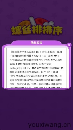 由海南奇颂网络科技有限公司提供的一款休闲益智小游戏,简单的玩法让你可以快速上手,规则也十分好理解,只需通过移动螺丝就可以完成,将所有相同螺丝放置到同一柱子上即可过关,每次过关都可以领取丰富奖励哦!