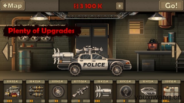 3、打造你的专属杀戮机器,各形各色的车辆,可装载的武器也会略有不同,合理选择升级你的车辆,不要给僵尸留下任何机会。