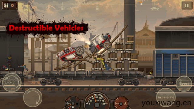 2、在行进过程中,你将会遇到众多拦路的僵尸,可以为你的战车配置武器进行攻击,也可以用最粗暴的撞击消灭它们。