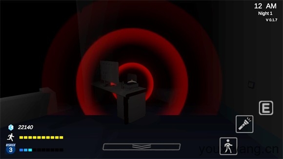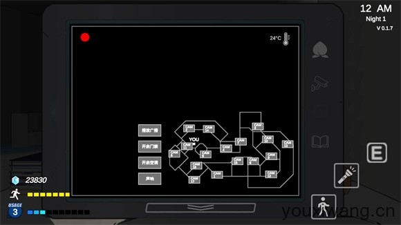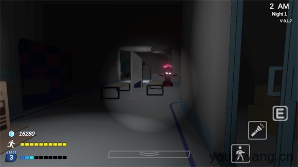 3、正式开始后左边控制角色移动,滑动屏幕可以控制转向,右边是互动、手电、奔跑按钮,点击向下的箭头可以打开平板查看不同的房间。