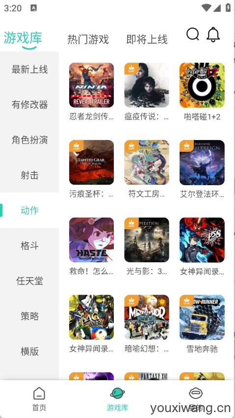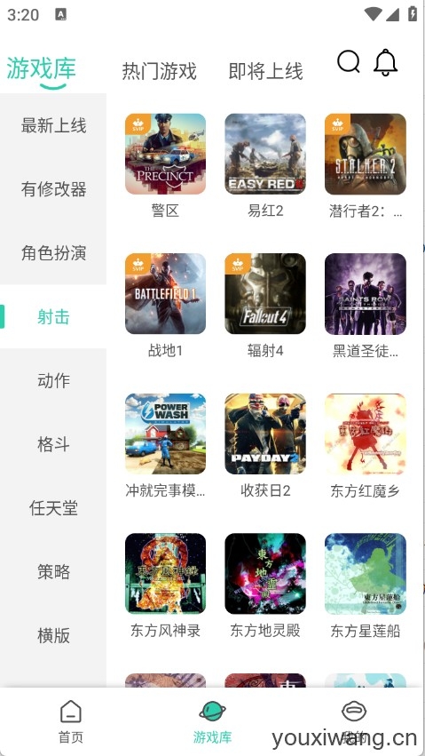3、游戏库页面将游戏进行了详细的归类,角色扮演、射击以及格斗等类型。
