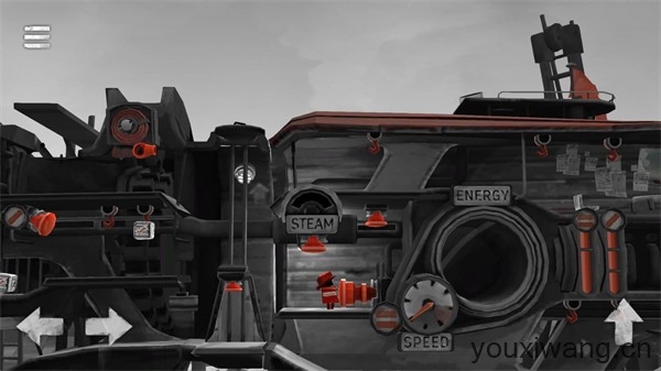 3、如果车起火你需要先用左上方的水来熄灭火,再用左边的焊枪修复(水枪是一开始就有的,焊枪要中后期才有)所以前期要保护好自己的蒸汽机。后期你会获得一个吸尘器,反正就是类似于自动吸取物资的机器,可以帮你把经过时的物资都吸起来,这样你就不用下车捡了,但是要记住,吸尘器,水枪,焊枪都需要消耗能量。