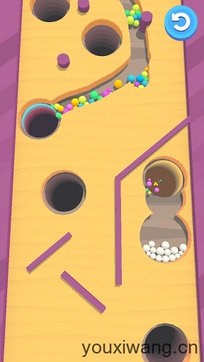 1、游戏中,滑动屏幕之后即可拨开沙子,这样就能让彩球落下,碰到白色球之后就会将其染成彩色。