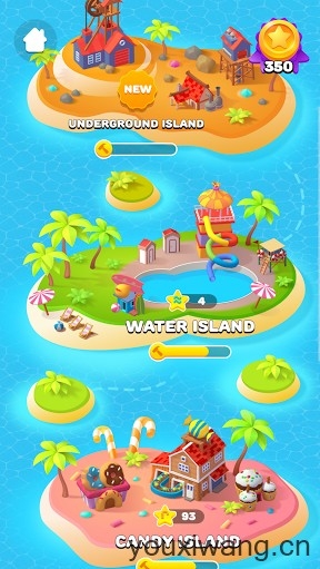 1、通过不断的完美过关来收集星星奖励,利用这些星星可以去建设起你的小岛,并不断的拓展更多地盘。